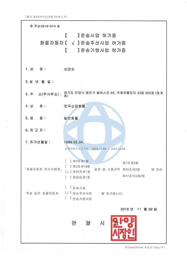 설립년도 | 1999년 5월 ▶ 2018년 상호변경 "전국신금화물" |